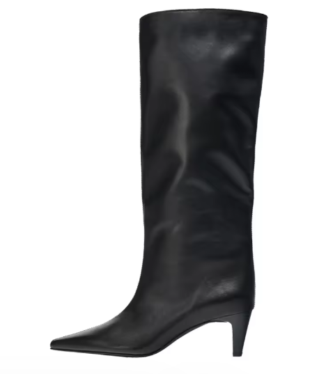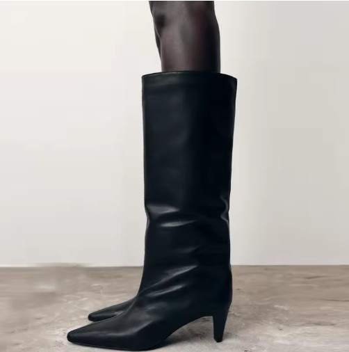 Stivali alti da donna in pelle nera, eleganti e versatili, pensati per completare con stile i look di tutti i giorni e le occasioni speciali. Il design essenziale è valorizzato dalla punta affusolata e dal gambale morbido, mentre il tacco a rocchetto medio assicura comfort e femminilità in ogni passo.